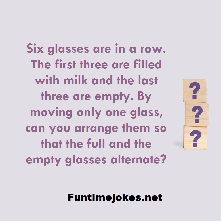 π Pop Balloon Riddles (Tap to reveal answers)Six glasses are in a row. The first three are filled with milk and the last three are empty. By moving only one glass, can you arrange them so that the full and the empty glasses alternate? is one of the best riddle of the day.We have best collections of riddles, You can see our best collection of Tricky Riddles with Answer