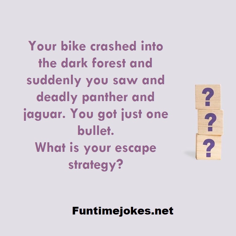 π Take the 15-Riddle Challenge (Win at 80%+)Your bike crashed into the dark forest and suddenly you saw and deadly panther and jaguar. You got just one bullet. What is your escape strategy?
