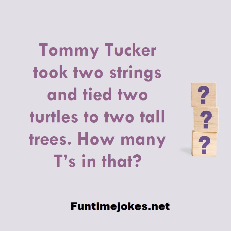 🎈 Pop Balloon Riddles (Tap to reveal answers)Tommy Tucker took two strings and tied two turtles to two tall trees. How many T’s in that? is one of the best riddle of the day.We have best collections of riddles, You can see our best collection of Tricky Riddles with Answer