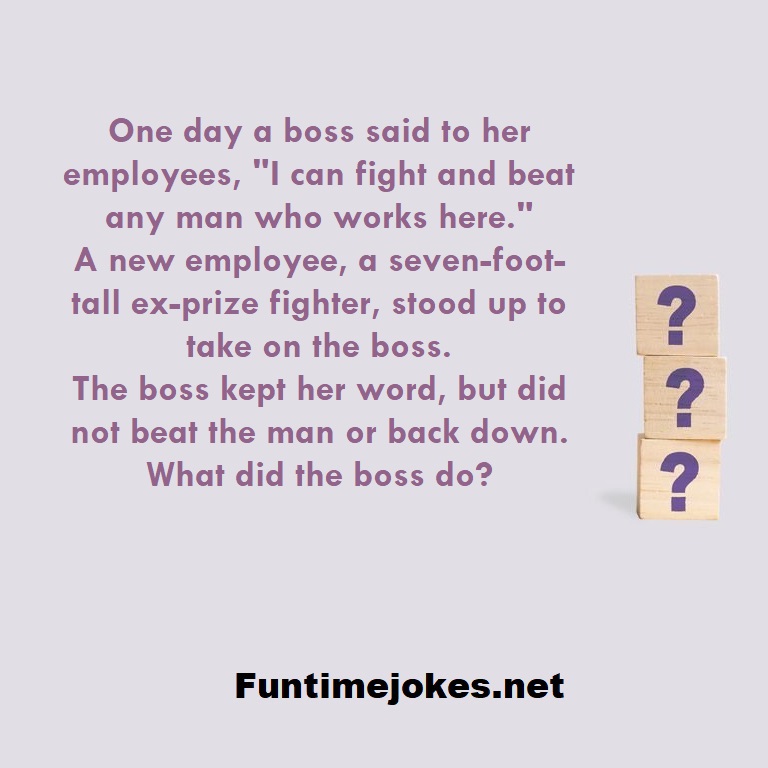 π Take the 15-Riddle Challenge (Win at 80%+)One day a boss said to her employees, "I can fight and beat any man who works here." A new employee, a seven-foot-tall ex-prize fighter, stood up to take on the boss. The boss kept her word, but did not beat the man or back down. What did the boss do?
