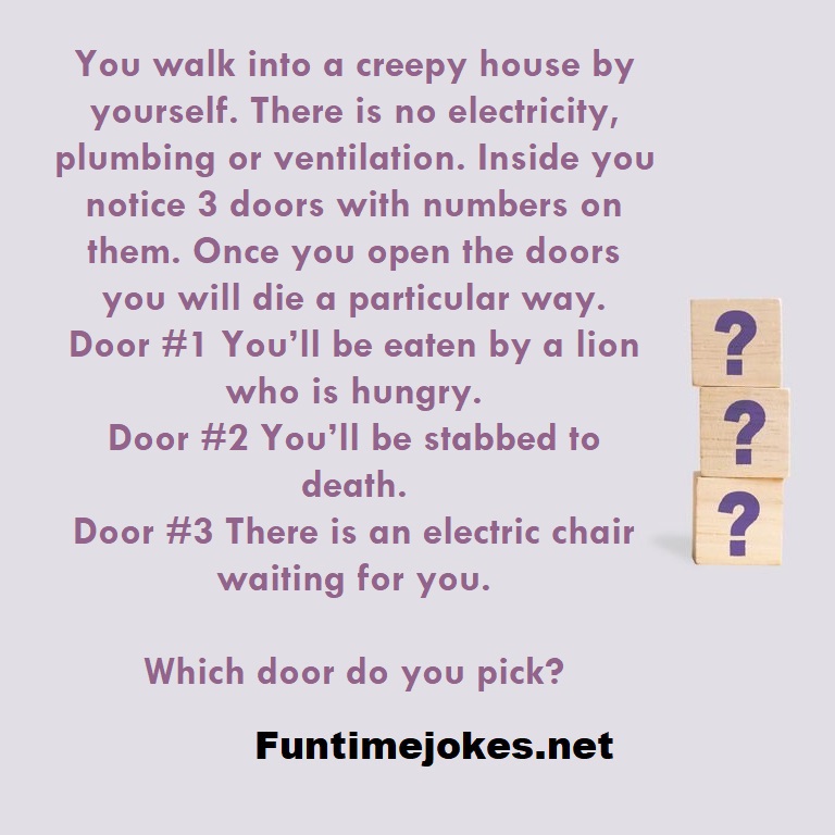 🏆 Take the 15-Riddle Challenge (Win at 80%+)You walk into a creepy house by yourself. There is no electricity, plumbing or ventilation. Inside you notice 3 doors with numbers on them. Once you open the doors you will die a particular way. Door #1 You’ll be eaten by a lion who is hungry. Door #2 You’ll be stabbed to death. Door #3 There is an electric chair waiting for you. Which door do you pick?