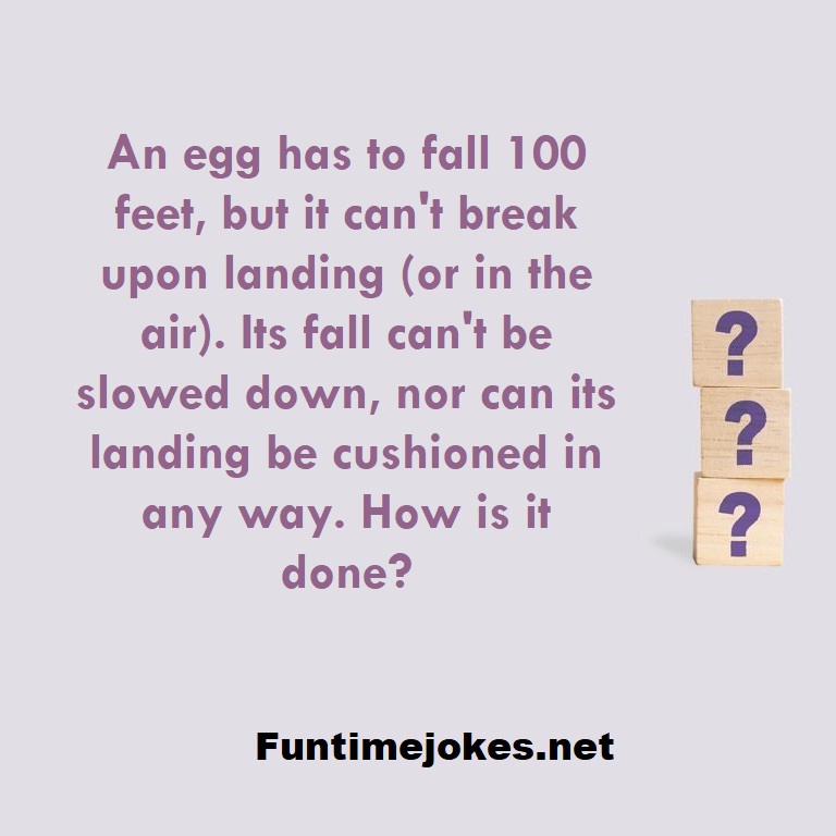 π Take the 15-Riddle Challenge (Win at 80%+)An egg has to fall 100 feet, but it can't break upon landing (or in the air). Its fall can't be slowed down, nor can its landing be cushioned in any way. How is it done?