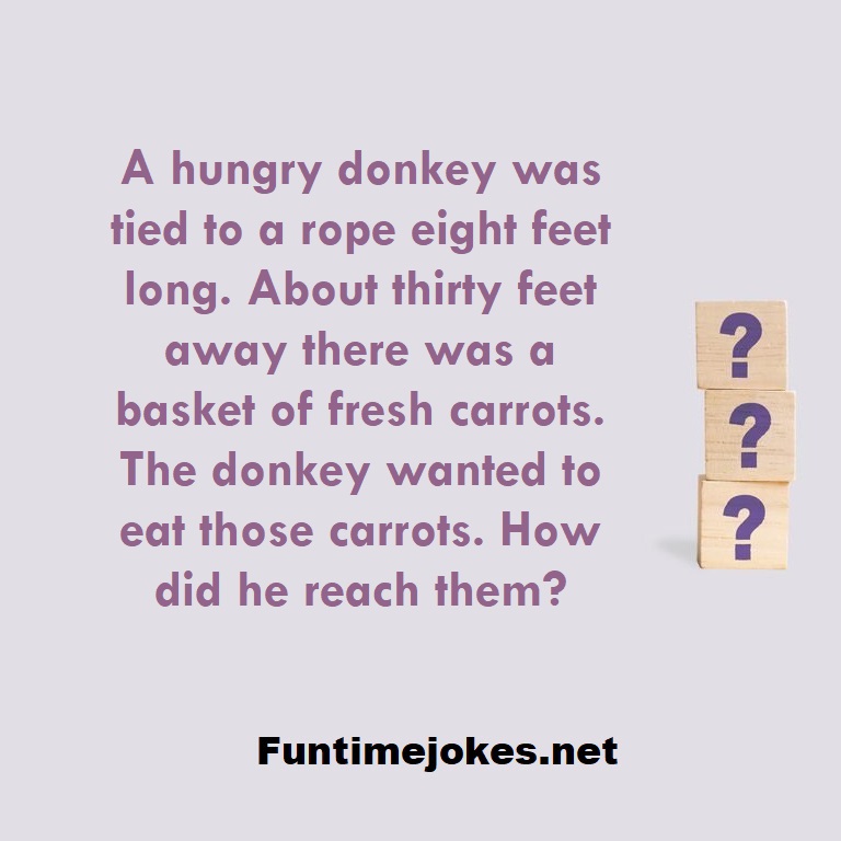 A hungry donkey was tied to a rope eight feet long. About thirty feet away there was a basket of fresh carrots. The donkey wanted to eat those carrots. How did he reach them? is one of the best riddle of the day.We have best collections of riddles, You can see our best collection of Tricky Riddles with Answer Funtimejokes be the be the world's most knowledge able riddle website on the internet for riddles, puzzles, rebus caps and quizzes. Our riddle library has interesting riddles and answers to riddles for adults and evoke deep thought and community discussion. Riddlers will benefit from the creativity of our members who participate in growth of our online riddles and puzzles resource. We encourage you to become a member of Riddles and receive daily/weekly free riddles email.