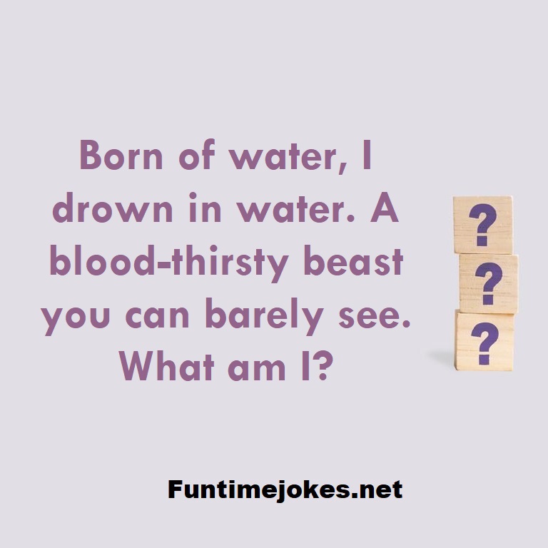 π Take the 15-Riddle Challenge (Win at 80%+)Born of water, I drown in water. A blood-thirsty beast you can barely see. What am I?
