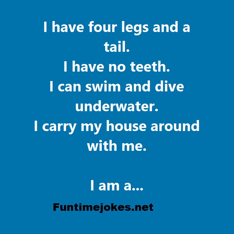 π Take the 15-Riddle Challenge (Win at 80%+)I have four legs and a tail. I have no teeth. I can swim and dive underwater. I carry my house around with me. I am a...