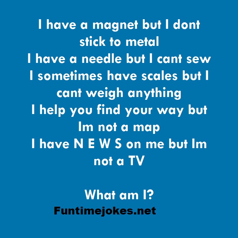 π Pop Balloon Riddles (Tap to reveal answers)I have a magnet but I dont stick to metal I have a needle but I cant sew I sometimes have scales but I cant weigh anything I help you find your way but Im not a map I have N E W S on me but Im not a TV What am I? is one of the best riddle of the day.We have best collections of riddles, You can see our best collection of Tricky Riddles with Answer