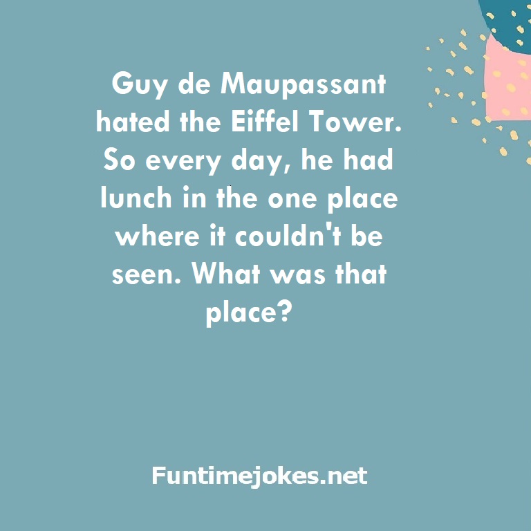 π Take the 15-Riddle Challenge (Win at 80%+)Guy de Maupassant hated the Eiffel Tower. So every day, he had lunch in the one place where it couldn't be seen. What was that place?