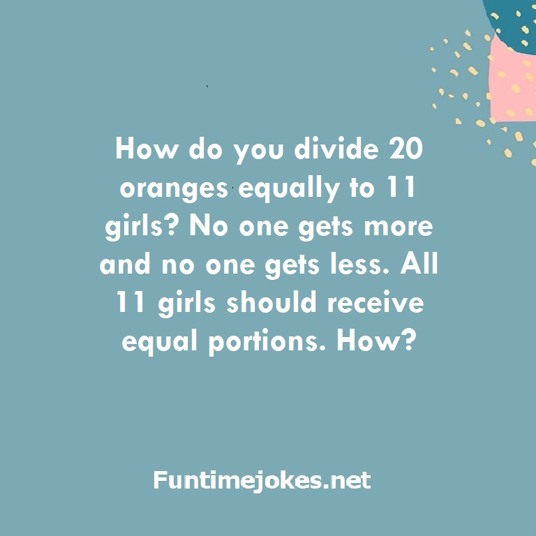 π Take the 15-Riddle Challenge (Win at 80%+)How do you divide 20 oranges equally to 11 girls? No one gets more and no one gets less. All 11 girls should receive equal portions. How?