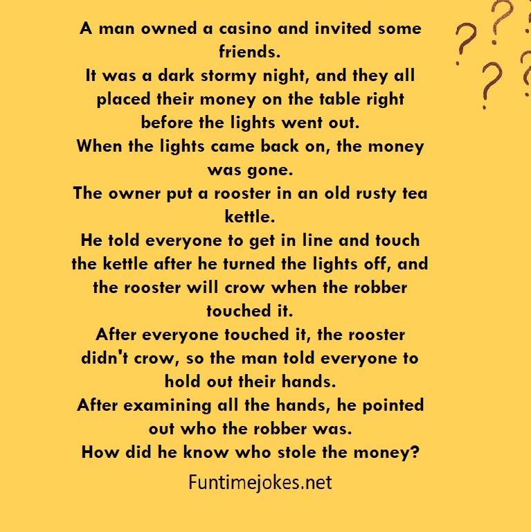 π Take the 15-Riddle Challenge (Win at 80%+)A man owned a casino and invited some friends. It was a dark stormy night, and they all placed their money on the table right before the lights went out. When the lights came back on, the money was gone. The owner put a rooster in an old rusty tea kettle. He told everyone to get in line and touch the kettle after he turned the lights off, and the rooster will crow when the robber touched it. After everyone touched it, the rooster didn't crow, so the man told everyone to hold out their hands. After examining all the hands, he pointed out who the robber was. How did he know who stole the money?