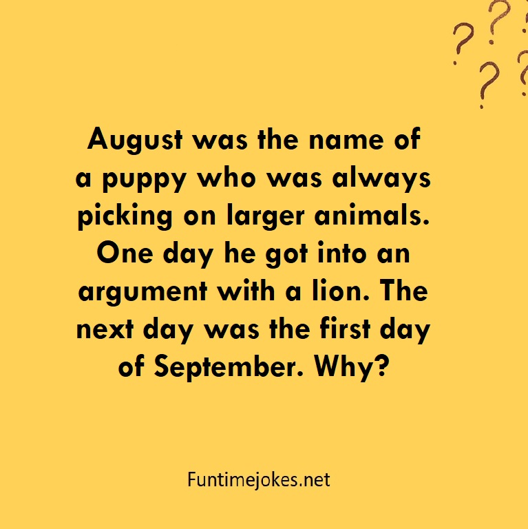 π Take the 15-Riddle Challenge (Win at 80%+)August was the name of a puppy who was always picking on larger animals. One day he got into an argument with a lion. The next day was the first day of September. Why?