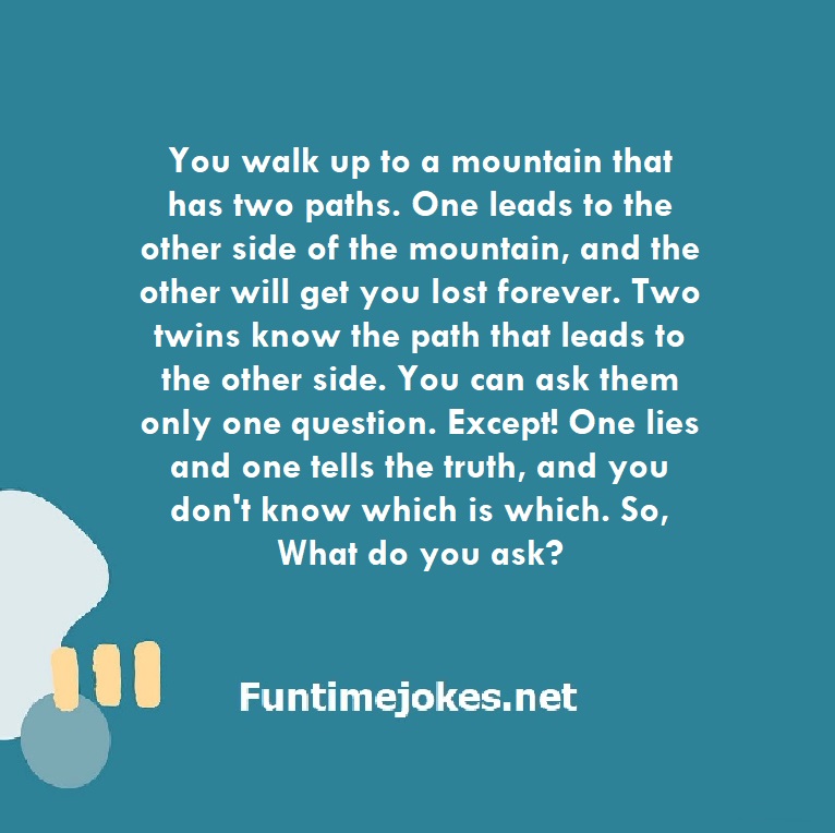 π Take the 15-Riddle Challenge (Win at 80%+)You walk up to a mountain that has two paths. One leads to the other side of the mountain, and the other will get you lost forever. Two twins know the path that leads to the other side. You can ask them only one question. Except! One lies and one tells the truth, and you don't know which is which. So, What do you ask?