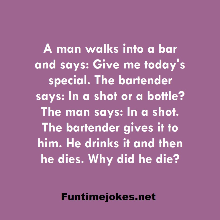 π Pop Balloon Riddles (Tap to reveal answers)A man walks into a bar and says: Give me today's special. The bartender says: In a shot or a bottle? The man says: In a shot. The bartender gives it to him. He drinks it and then he dies. Why did he die? is one of the best riddle of the day.We have best collections of riddles, You can see our best collection of Tricky Riddles with Answer
