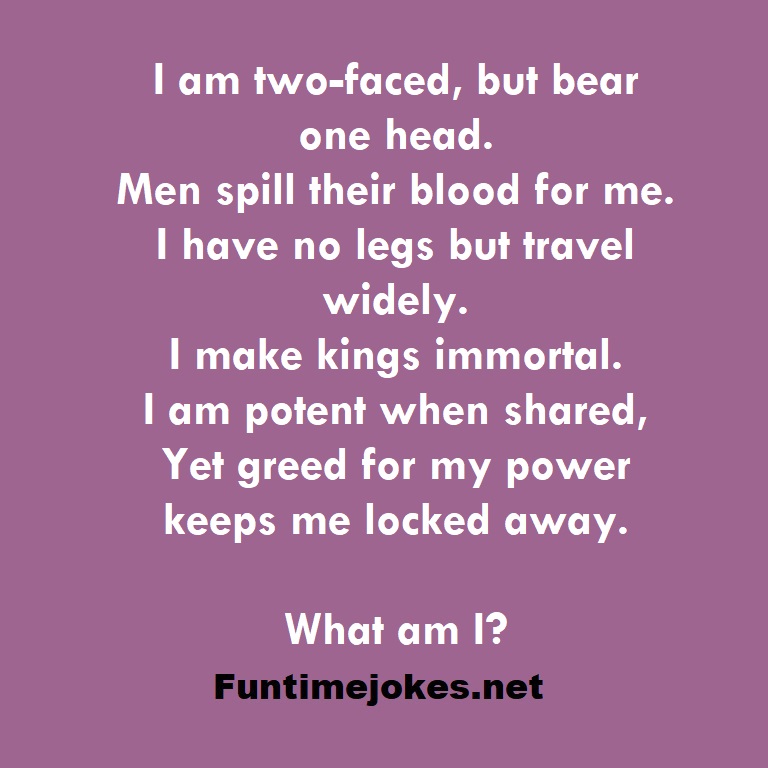 π Take the 15-Riddle Challenge (Win at 80%+)I am two-faced, but bear one head. Men spill their blood for me. I have no legs but travel widely. I make kings immortal. I am potent when shared, Yet greed for my power keeps me locked away. What am I?