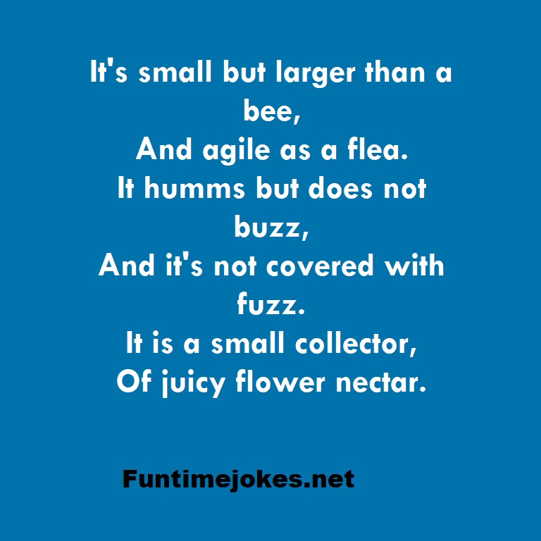 π Take the 15-Riddle Challenge (Win at 80%+)It's small but larger than a bee, And agile as a flea. It humms but does not buzz, And it's not covered with fuzz. It is a small collector, Of juicy flower nectar.