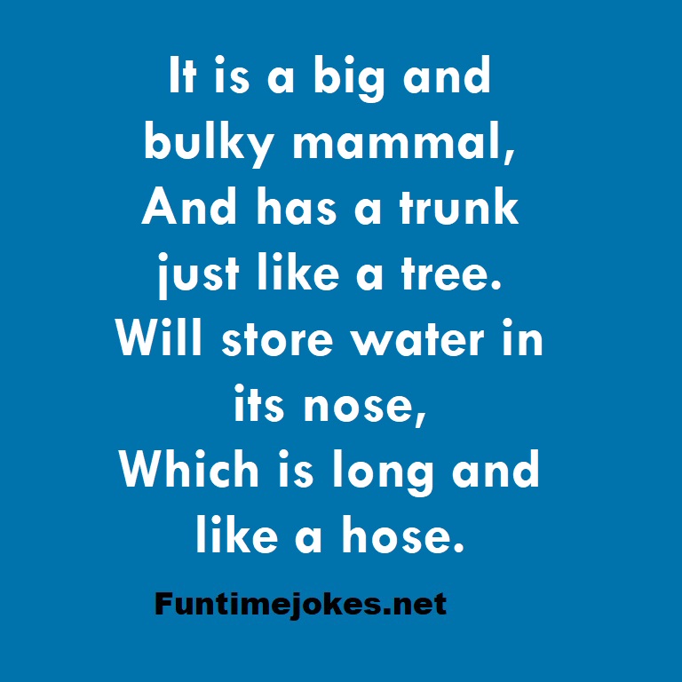 π Take the 15-Riddle Challenge (Win at 80%+)It is a big and bulky mammal, And has a trunk just like a tree. Will store water in its nose, Which is long and like a hose.