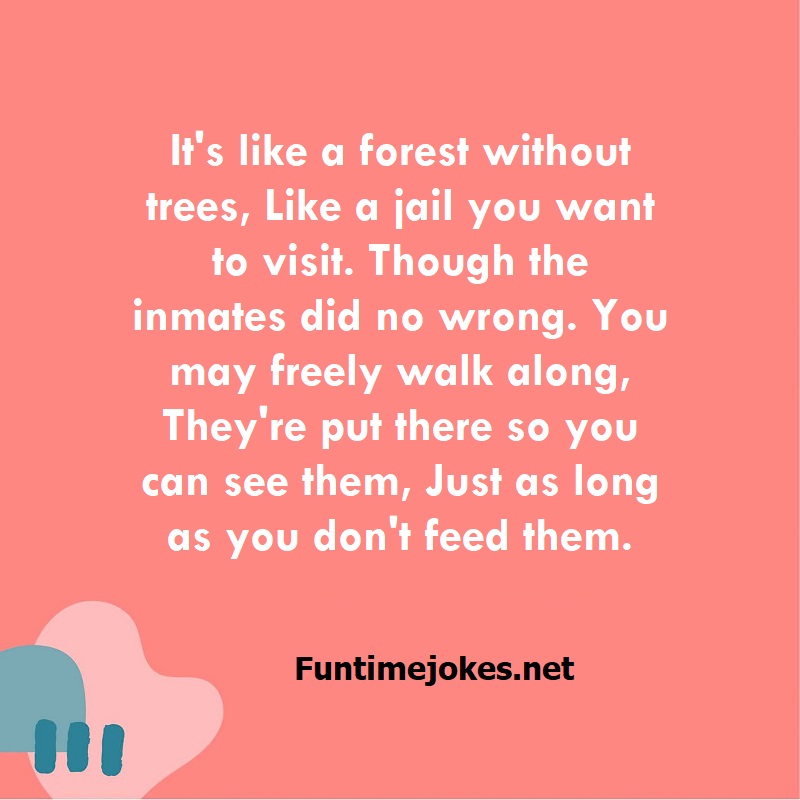 π Take the 15-Riddle Challenge (Win at 80%+)It's like a forest without trees, Like a jail you want to visit. Though the inmates did no wrong. You may freely walk along, They're put there so you can see them, Just as long as you don't feed them.