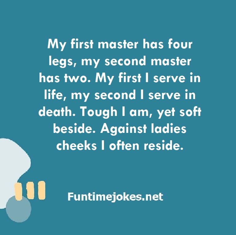 π Take the 15-Riddle Challenge (Win at 80%+)My first master has four legs, my second master has two. My first I serve in life, my second I serve in death. Tough I am, yet soft beside. Against ladies cheeks I often reside.