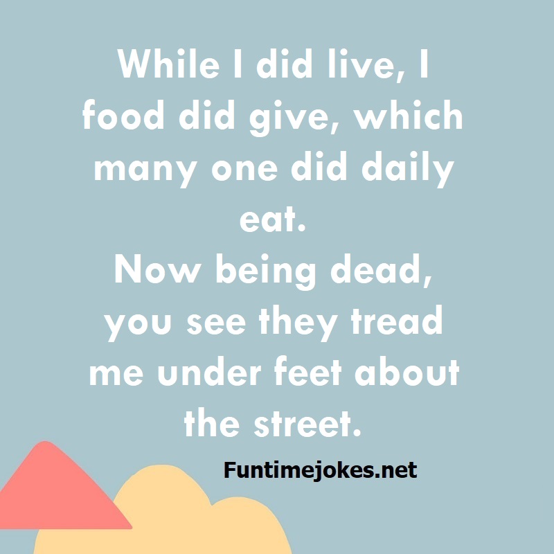 π Take the 15-Riddle Challenge (Win at 80%+)While I did live, I food did give, which many one did daily eat. Now being dead, you see they tread me under feet about the street.