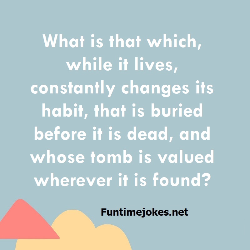 π Take the 15-Riddle Challenge (Win at 80%+)What is that which, while it lives, constantly changes its habit, that is buried before it is dead, and whose tomb is valued wherever it is found?