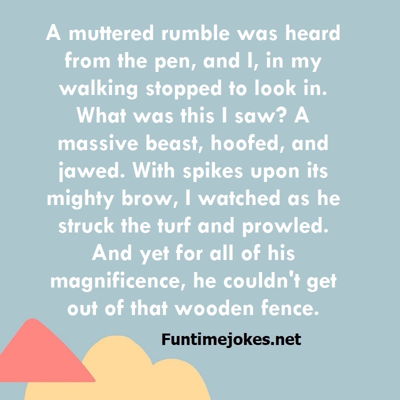 π Take the 15-Riddle Challenge (Win at 80%+)A muttered rumble was heard from the pen, and I, in my walking stopped to look in. What was this I saw? A massive beast, hoofed, and jawed. With spikes upon its mighty brow, I watched as he struck the turf and prowled. And yet for all of his magnificence, he couldn't get out of that wooden fence.