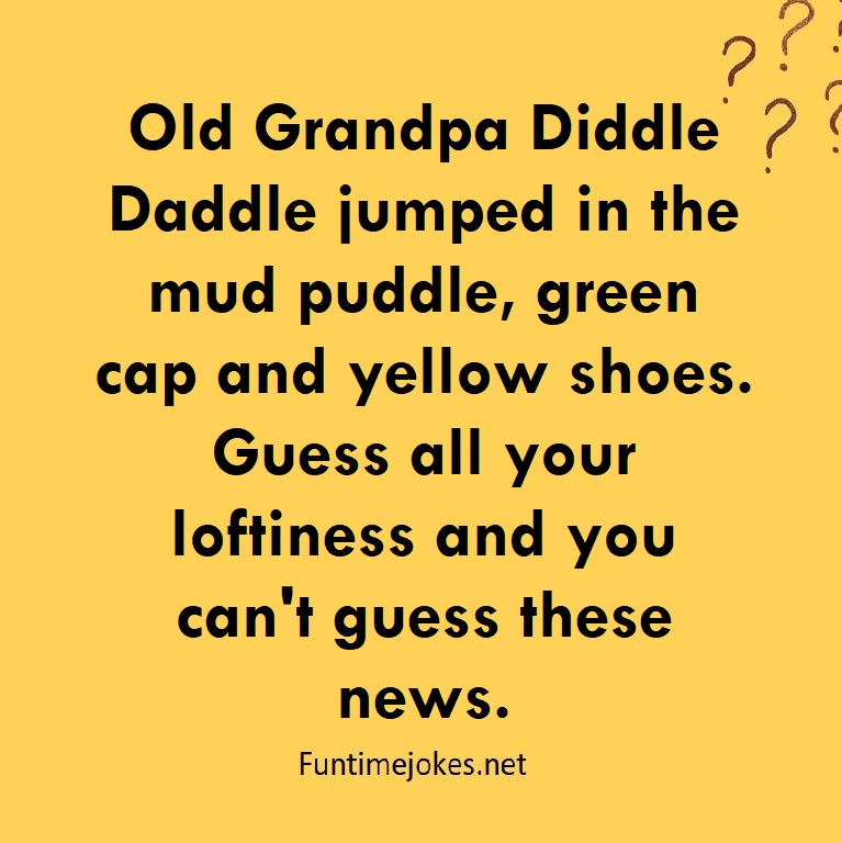 π Take the 15-Riddle Challenge (Win at 80%+)Old Grandpa Diddle Daddle jumped in the mud puddle, green cap and yellow shoes. Guess all your loftiness and you can't guess these news.