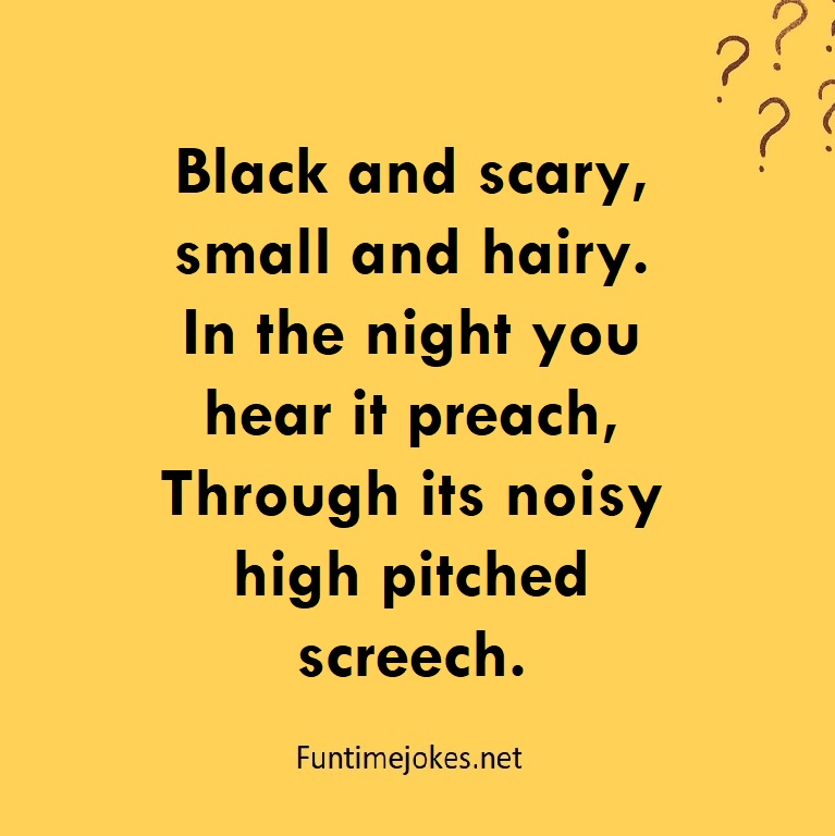 π Take the 15-Riddle Challenge (Win at 80%+)Black and scary, small and hairy. In the night you hear it preach, Through its noisy high pitched screech.