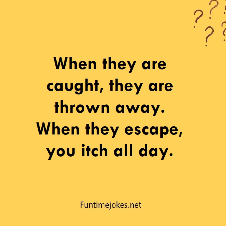 When they are caught, they are thrown away. When they escape, you itch all day. is one of the best riddle of the day.We have best collections of riddles, You can see our best collection of Tricky Riddles with Answer Funtimejokes be the be the world's most knowledge able riddle website on the internet for riddles, puzzles, rebus caps and quizzes. Our riddle library has interesting riddles and answers to riddles for adults and evoke deep thought and community discussion. Riddlers will benefit from the creativity of our members who participate in growth of our online riddles and puzzles resource. We encourage you to become a member of Riddles and receive daily/weekly free riddles email.