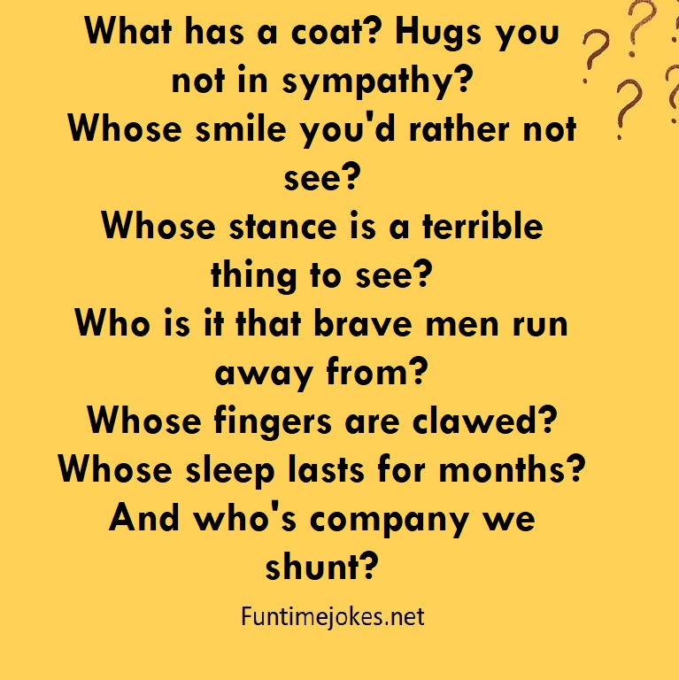 π Take the 15-Riddle Challenge (Win at 80%+)What has a coat? Hugs you not in sympathy? Whose smile you'd rather not see? Whose stance is a terrible thing to see? Who is it that brave men run away from? Whose fingers are clawed? Whose sleep lasts for months? And who's company we shunt?