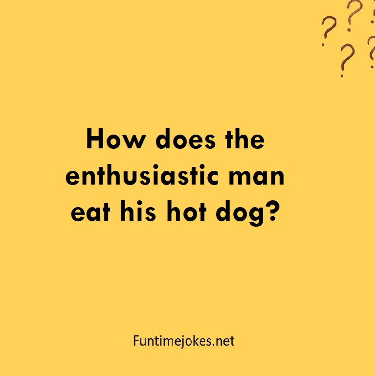 π Pop Balloon Riddles (Tap to reveal answers)How does the enthusiastic man eat his hot dog? is one of the best riddle of the day.We have best collections of riddles, You can see our best collection of Tricky Riddles with Answer