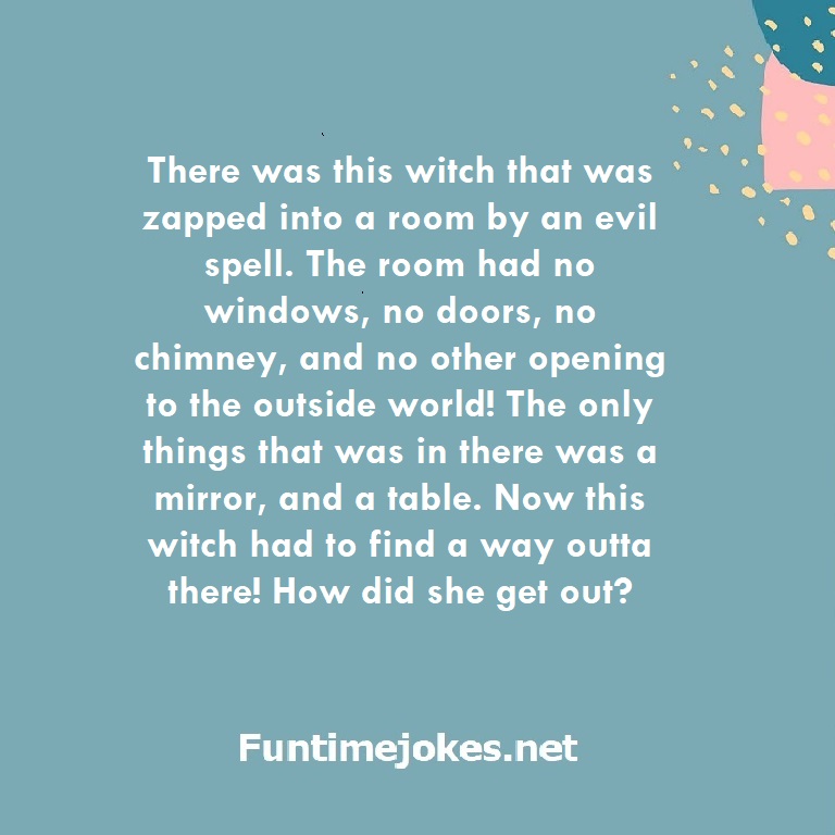π Pop Balloon Riddles (Tap to reveal answers)There was this witch that was zapped into a room by an evil spell. The room had no windows, no doors, no chimney, and no other opening to the outside world! The only things that was in there was a mirror, and a table. Now this witch had to find a way outta there! How did she get out? is one of the best riddle of the day.We have best collections of riddles, You can see our best collection of Tricky Riddles with Answer