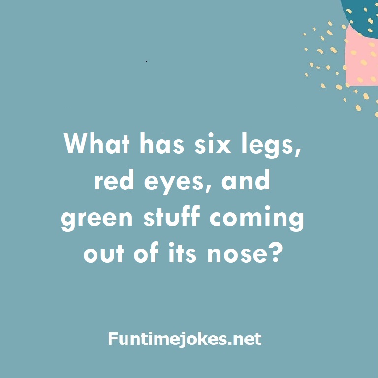 π Take the 15-Riddle Challenge (Win at 80%+)What has six legs, red eyes, and green stuff coming out of its nose?