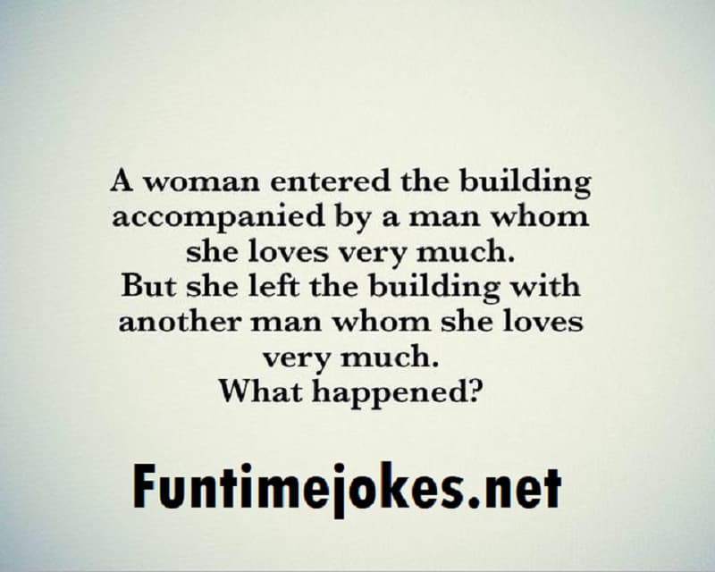π Pop Balloon Riddles (Tap to reveal answers)A woman entered the building accompanied by a man whom she loves very much. But she left the building with another man whom she loves very much. What happened? is one of the best riddle of the day.We have best collections of riddles, You can see our best collection of Tricky Riddles with Answer