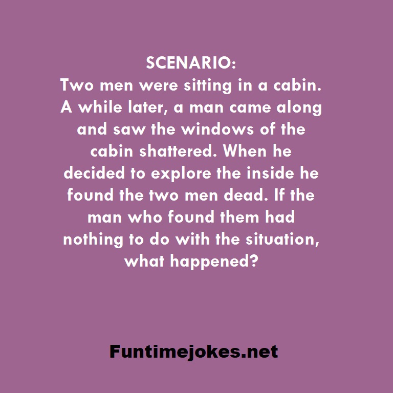 π Take the 15-Riddle Challenge (Win at 80%+)SCENARIO: Two men were sitting in a cabin. A while later, a man came along and saw the windows of the cabin shattered. When he decided to explore the inside he found the two men dead. If the man who found them had nothing to do with the situation, what happened?