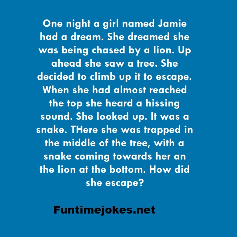 π Pop Balloon Riddles (Tap to reveal answers)One night a girl named Jamie had a dream. She dreamed she was being chased by a lion. Up ahead she saw a tree. She decided to climb up it to escape. When she had almost reached the top she heard a hissing sound. She looked up. It was a snake. THere she was trapped in the middle of the tree, with a snake coming towards her an the lion at the bottom. How did she escape? is one of the best riddle of the day.We have best collections of riddles, You can see our best collection of Tricky Riddles with Answer