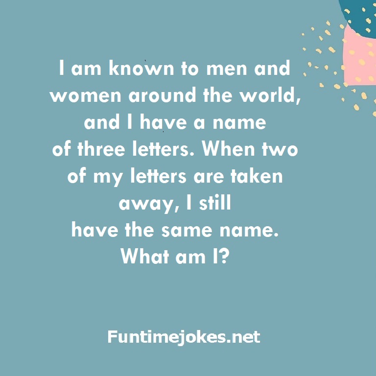 π Take the 15-Riddle Challenge (Win at 80%+)I am known to men and women around the world, and I have a name of three letters. When two of my letters are taken away, I still have the same name. What am I?