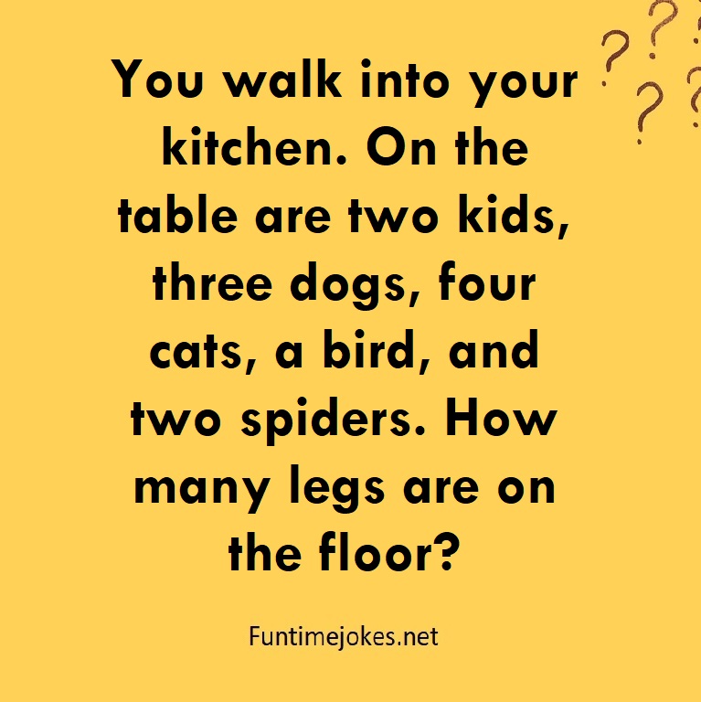 🏆 Take the 15-Riddle Challenge (Win at 80%+)You walk into your kitchen. On the table are two kids, three dogs, four cats, a bird, and two spiders. How many legs are on the floor?