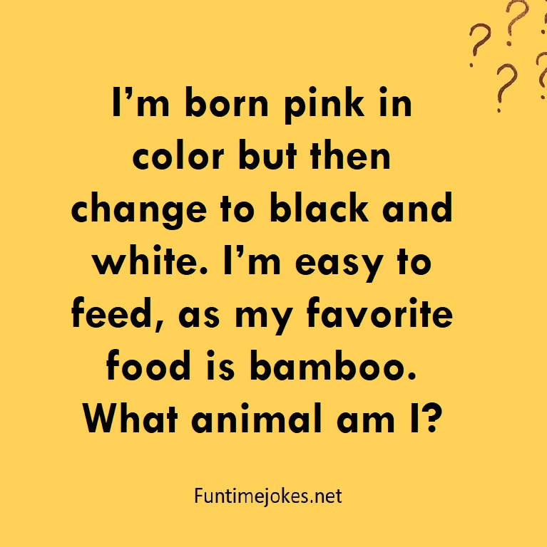 🏆 Take the 15-Riddle Challenge (Win at 80%+)I’m born pink in color but then change to black and white. I’m easy to feed, as my favorite food is bamboo. What animal am I?