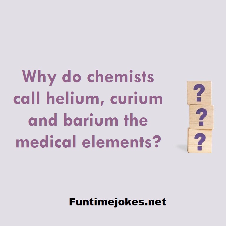 π Pop Balloon Riddles (Tap to reveal answers)Why do chemists call helium, curium and barium the medical elements? is one of the best riddle of the day.We have best collections of riddles, You can see our best collection of Tricky Riddles with Answer