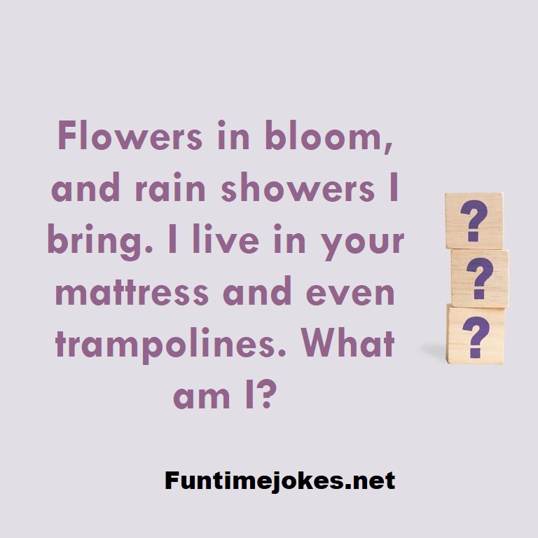π Take the 15-Riddle Challenge (Win at 80%+)Flowers in bloom, and rain showers I bring. I live in your mattress and even trampolines. What am I?