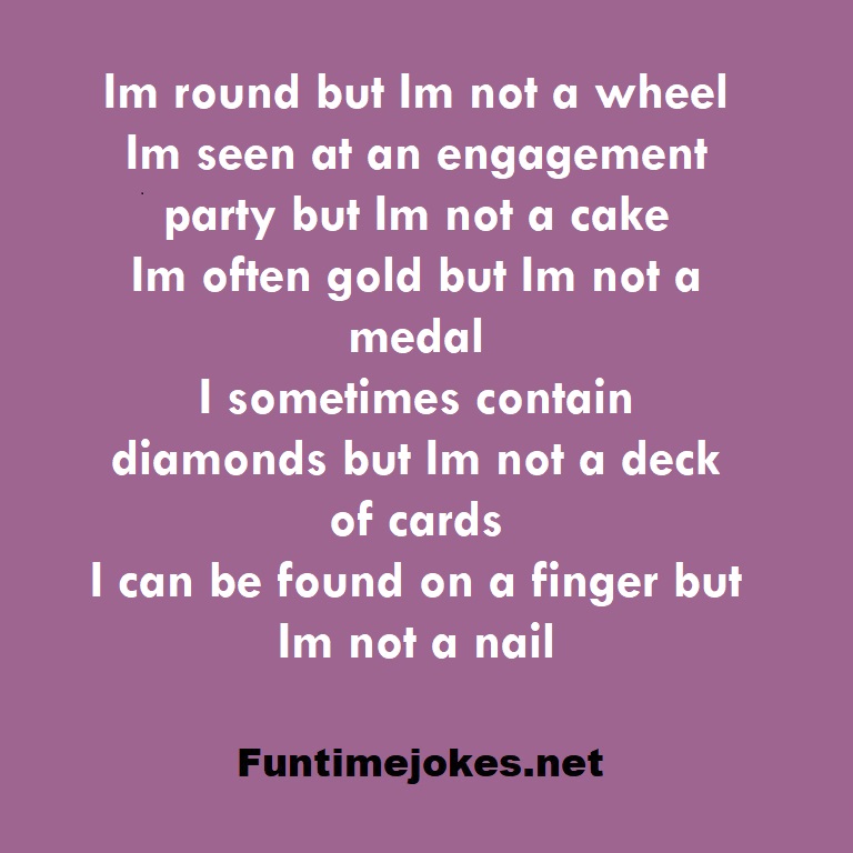 Im round but Im not a wheel Im seen at an engagement party but Im not a cake Im often gold but Im not a medal I sometimes contain diamonds but Im not a deck of cards I can be found on a finger but Im not a nail is one of the best riddle of the day.We have best collections of riddles, You can see our best collection of Tricky Riddles with Answer