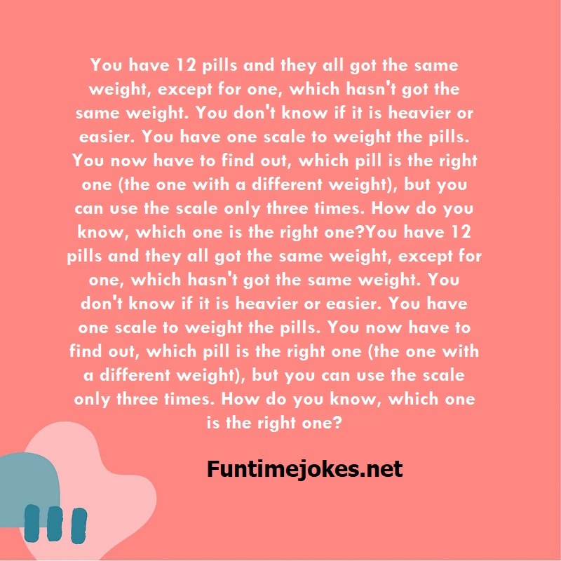 You have 12 pills and they all got the same weight, except for one, which hasn't got the same weight. You don't know if it is heavier or easier. You have one scale to weight the pills. You now have to find out, which pill is the right one (the one with a different weight), but you can use the scale only three times. How do you know, which one is the right one?You have 12 pills and they all got the same weight, except for one, which hasn't got the same weight. You don't know if it is heavier or easier. You have one scale to weight the pills. You now have to find out, which pill is the right one (the one with a different weight), but you can use the scale only three times. How do you know, which one is the right one? is one of the best riddle of the day.We have best collections of riddles, You can see our best collection of Tricky Riddles with Answer