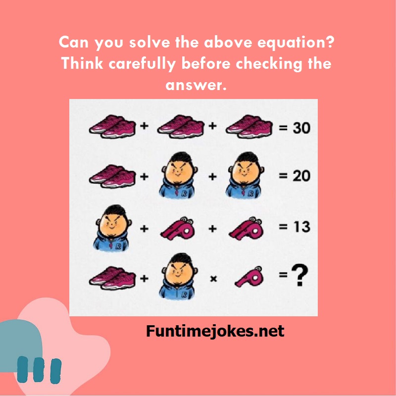 Explaination:- The third equation has a term with a pair of whistles. The last line involves a single whistle. Furthermore, the man in the second and third lines are wearing a whistle, but the man in the last line is not wearing a whistle. Presumably the value of the whistle should be accounted for to get the correct answer. The pictures can be translated into the following equations: shoes + shoes + shoes = 30 shoes + (man + whistle) + (man + whistle) = 20 (man + whistle) + 2(whistles) + 2(whistles) = 13 shoes + (man) x (whistle) = ? From the first equation we can solve for the shoes value: shoes + shoes + shoes = 30 3(shoes) = 30 shoes = 10 We can then solve the second equation for the (man + whistle) value: shoes + (man + whistle) + (man + whistle) = 20 10 + 2(man + whistle) = 20 2(man + whistle) = 10 man + whistle = 5 Then we solve the third equation for the whistle: (man + whistle) + 2(whistles) + 2(whistles) = 13 5 + 4(whistles) = 13 4(whistles) = 8 whistle = 2 We also need to solve for the value of the man: man + whistle = 5 man + 2 = 5 man = 3 Now we can evaluate the final expression, remembering the order of operations that multiplication should be evaluated before addition: shoes + (man) x (whistle) = ? 10 + 3 x 2 = 10 + 3 x 2 = 10 + 6 = 16