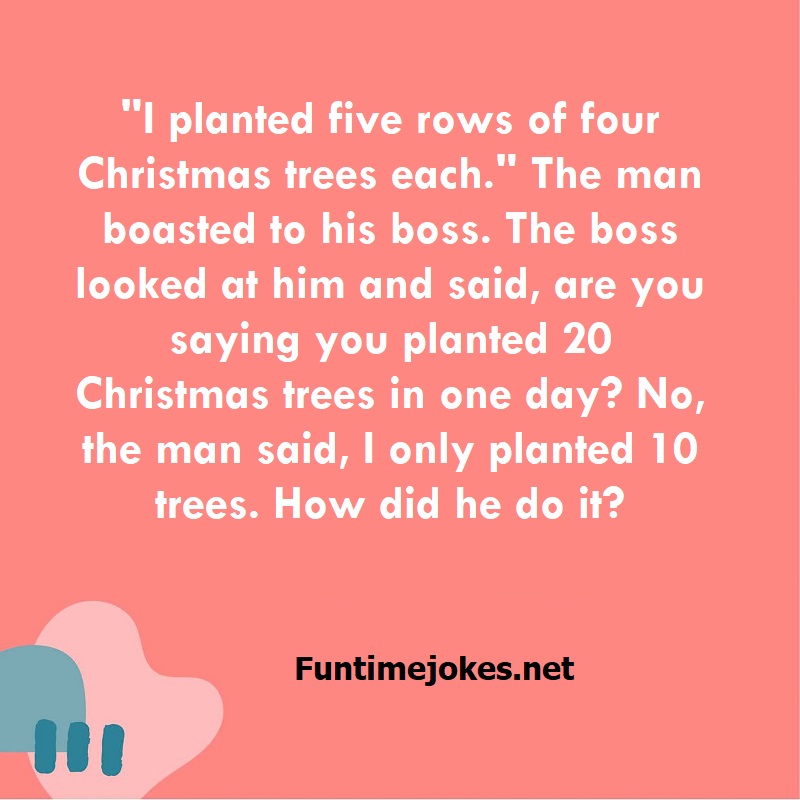 "I planted five rows of four Christmas trees each." The man boasted to his boss. The boss looked at him and said, are you saying you planted 20 Christmas trees in one day? No, the man said, I only planted 10 trees. How did he do it? is one of the best riddle of the day.We have best collections of riddles, You can see our best collection of Tricky Riddles with Answer