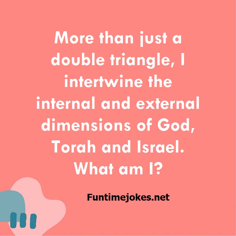 More than just a double triangle, I intertwine the internal and external dimensions of God, Torah and Israel. What am I? is one of the best riddle of the day.We have best collections of riddles, You can see our best collection of Tricky Riddles with Answer