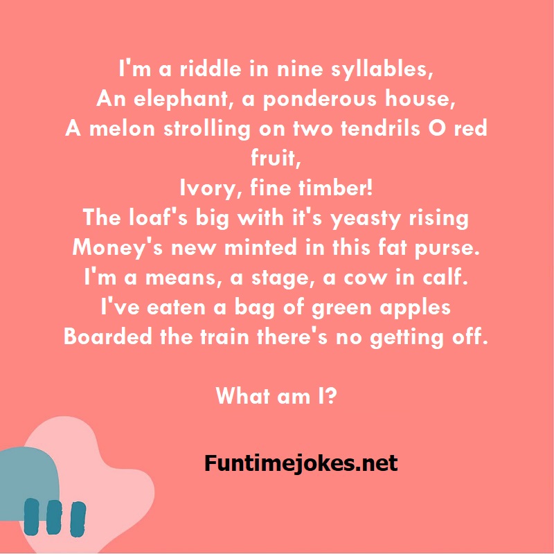 I'm a riddle in nine syllables, An elephant, a ponderous house, A melon strolling on two tendrils O red fruit, Ivory, fine timber! The loaf's big with it's yeasty rising Money's new minted in this fat purse. I'm a means, a stage, a cow in calf. I've eaten a bag of green apples Boarded the train there's no getting off. What am I? is one of the best riddle of the day.We have best collections of riddles, You can see our best collection of Tricky Riddles with Answer