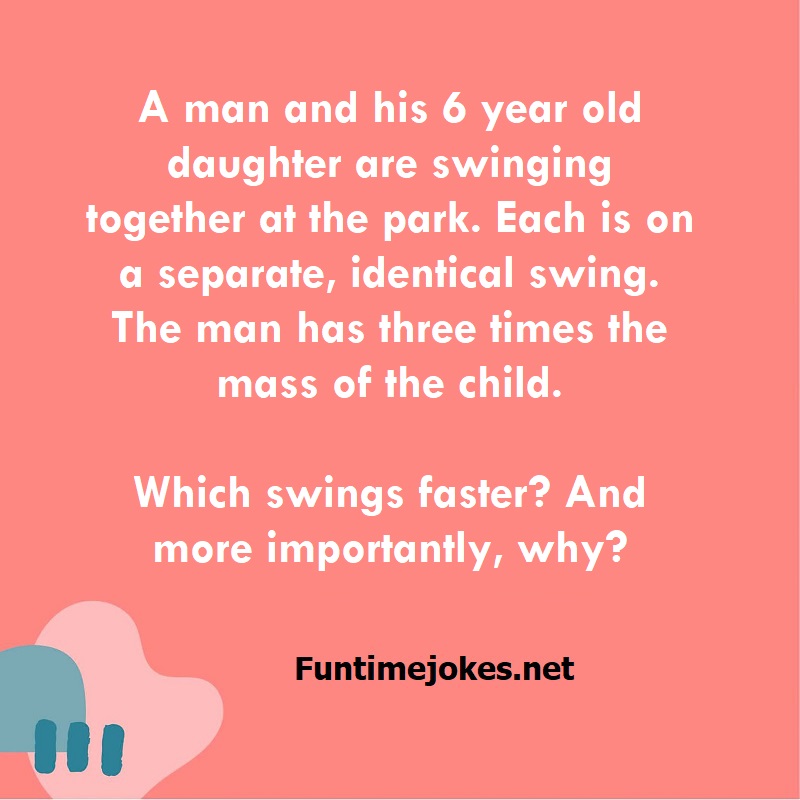 A man and his 6 year old daughter are swinging together at the park. Each is on a separate, identical swing. The man has three times the mass of the child. Which swings faster? And more importantly, why? is one of the best riddle of the day.We have best collections of riddles, You can see our best collection of Tricky Riddles with Answer
