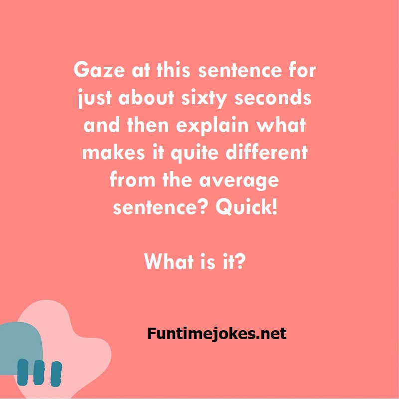 Gaze at this sentence for just about sixty seconds and then explain what makes it quite different from the average sentence? Quick! What is it? is one of the best riddle of the day.We have best collections of riddles, You can see our best collection of Tricky Riddles with Answer