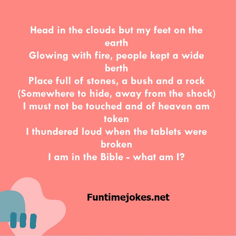 Head in the clouds but my feet on the earth Glowing with fire, people kept a wide berth Place full of stones, a bush and a rock (Somewhere to hide, away from the shock) I must not be touched and of heaven am token I thundered loud when the tablets were broken I am in the Bible - what am I? is one of the best riddle of the day.We have best collections of riddles, You can see our best collection of Tricky Riddles with Answer