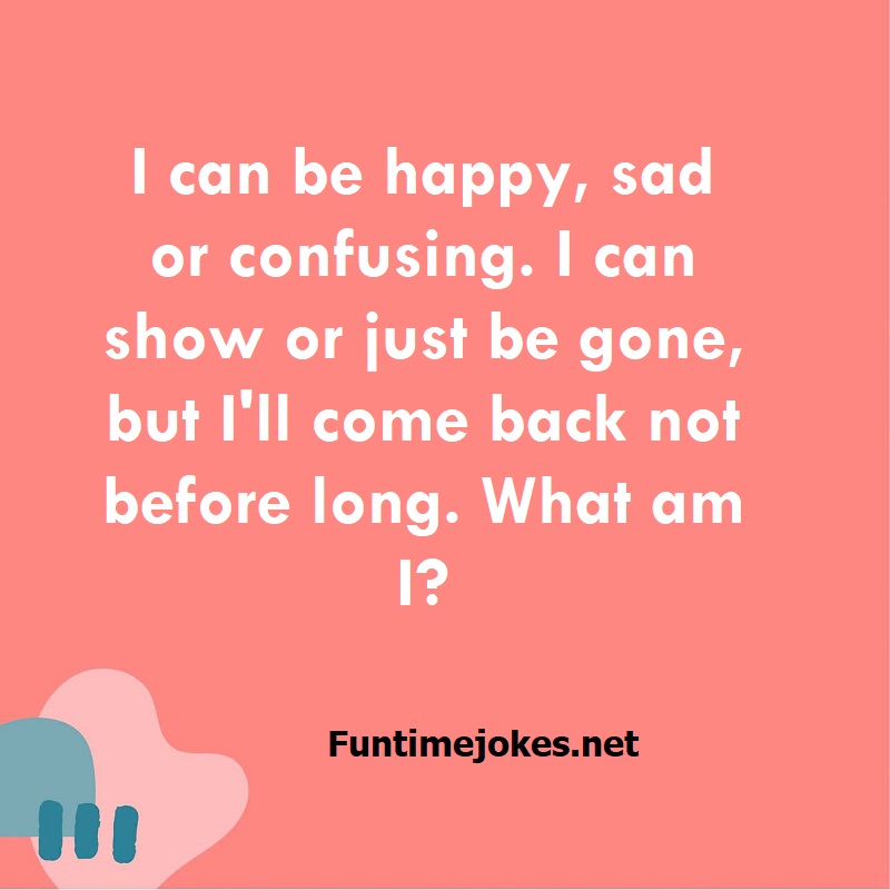 I can be happy, sad or confusing. I can show or just be gone, but I'll come back not before long. What am I? is one of the best riddle of the day.We have best collections of riddles, You can see our best collection of Tricky Riddles with Answer
