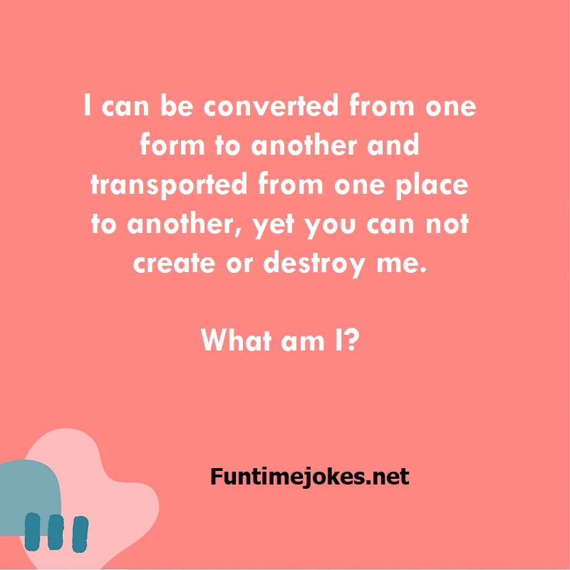 I can be converted from one form to another and transported from one place to another, yet you can not create or destroy me. What am I? is one of the best riddle of the day.We have best collections of riddles, You can see our best collection of Tricky Riddles with Answer